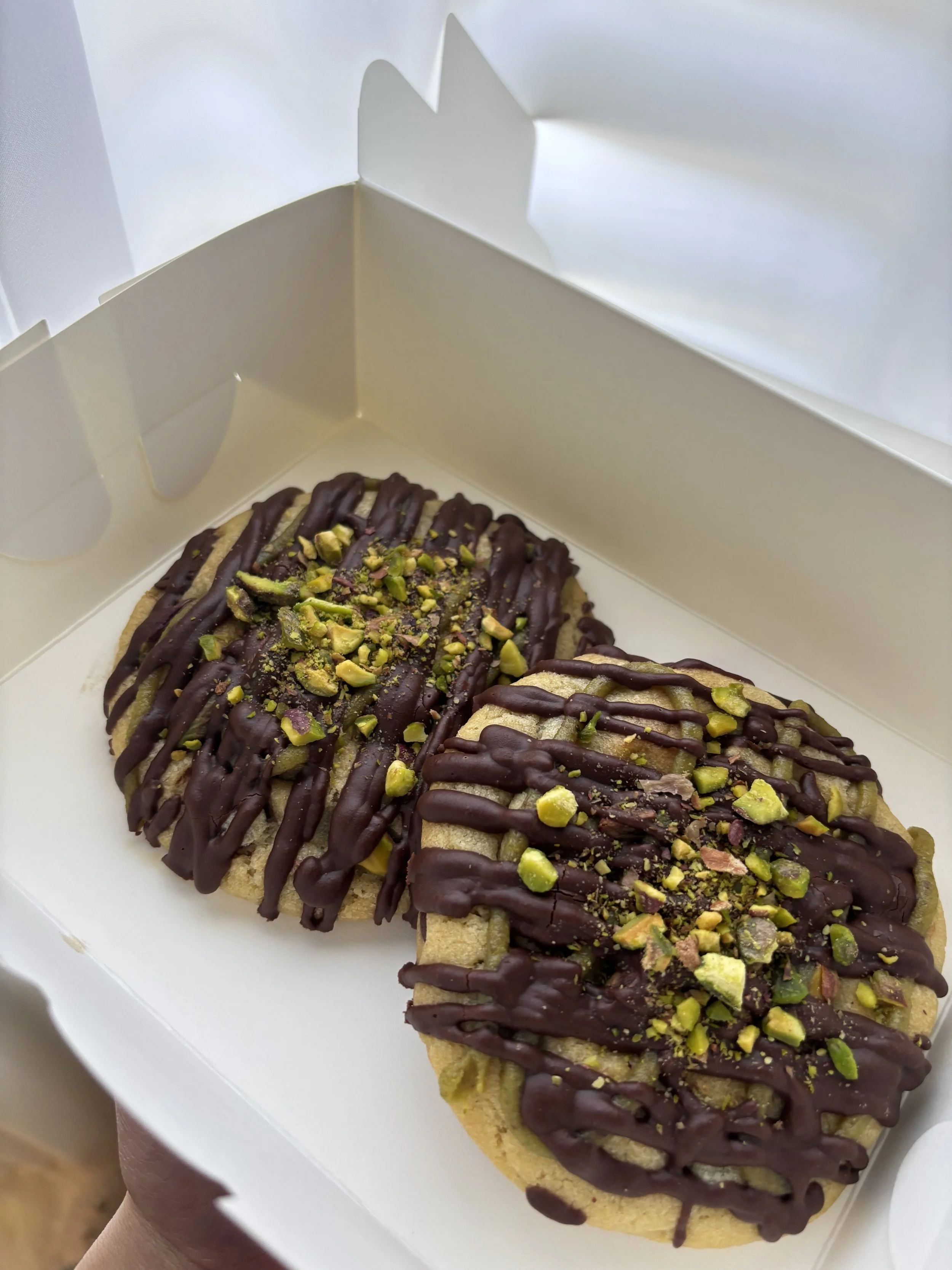 Our Creamy Pistachio Chocolate Chip Cookie—a soft, buttery cookie filled with luscious pistachio cream, drizzled with rich chocolate, and topped with crunchy pistachios for the perfect balance of nutty and sweet flavors.